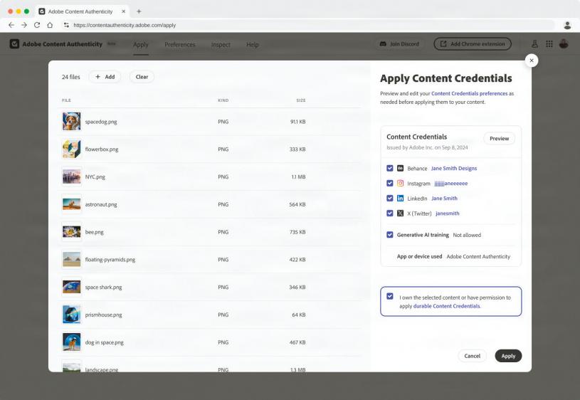 該網頁程式將與Adobe的Firefly AI模型整合,並且能與Photoshop、Lightroom及其他已經支持內容憑證的Creative Cloud程式等一起使用。重要的是,該程式將允許創作者將內容憑證應用於任何圖片、視頻和音頻檔案,而不僅僅限於使用Adobe應用程式製作的作品。