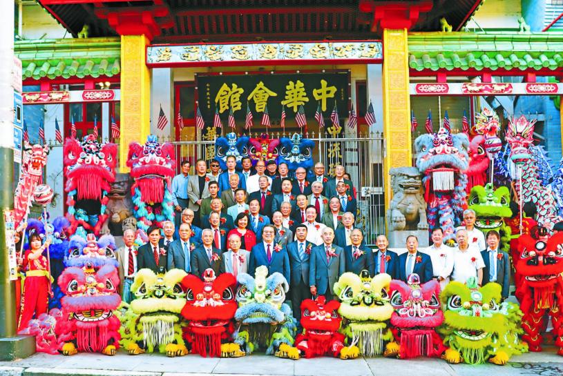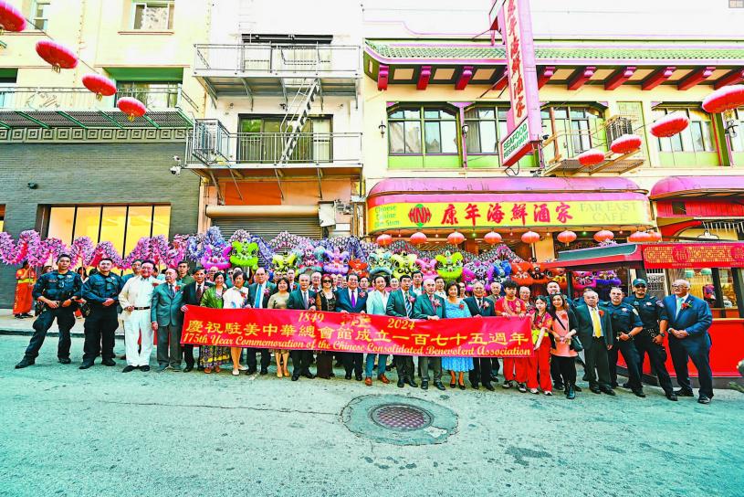 ( 僑社記者馬紅兵報導 ) 10月5日,中華總會館舉行成立175週年盛大慶祝活動。下午四時,總會館門前人如潮湧,鑼鼓喧天,金龍醒獅匯聚,歡騰躍舞,熱鬧非凡。中華總會館總董暨寧陽總會館主席雷華欽、肇慶總會館主席張耀廷、合和總會館主席謝躍池、岡州總會館主席張逢濯、陽和總會館主席陳國慶、三邑總會館主席楊國興、人和總會館主席蔣澤綿、通事劉榮浩、中文助理廖伽敏暨商董、嘉賓齊聚在總會館門前大合影。隨後組成聲勢浩大的巡遊隊伍,沿途金龍醒獅伴隨,喜慶鼓聲齊鳴,從中華總會館出發,途經華埠市德頓街、積臣街、都板街,抵達華埠康年酒家,在門前點燃十萬發吉祥鞭炮,響徹華埠。中領館總領事張建敏、總領事夫人鄭心女士、領僑處主任王一鳴;三藩市市長布里德、州參議員威善高、市參事會主席佩斯金、市政府律師邱信福、市地檢官謝安宜、州眾議員丁右立及市參事陳詩敏的代表、市警察局助理局長David Lazar、三藩市縣警官員、警察委員余健全;美國華商總會會長孫志雄、舊金山中華總商會副會長李婉兒;東華醫院院長余健峰、行政總裁張建清暨僑界首長、嘉賓友好出席聯歡慶會,共襄盛舉。警察委員余健全、商董李殿邦共同擔任中英文司儀。