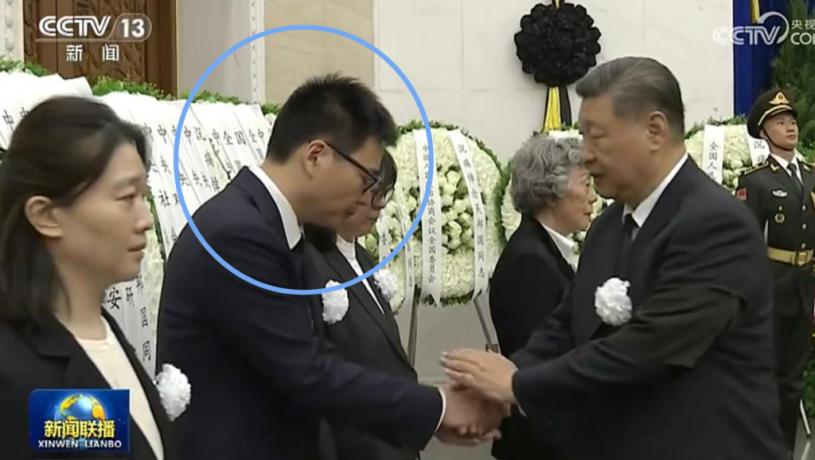 央視新聞聯播播出吳邦國喪禮的畫面。習近平與吳邦國遺孀章瑞珍握手,表示慰問,之後又與吳邦國兒子吳磊握手。