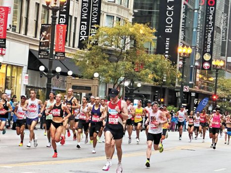 飛毛腿的長跑選手如千軍萬馬般衝進州街、他們速度驚人的快捷、一瞬間已經消失了蹤影;第二波大軍是普通選手,人數超過4萬多的參賽選手,如過江之鯽的一波又一波的出現在州街,繼續朝向芝加哥的29個不同社區的賽程前進。