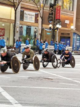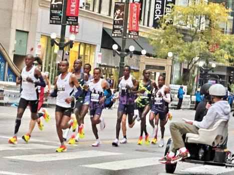 13日的芝加哥,迎來了初秋和煦的氣候,當天的氣溫是華氏60度左右,涼風習習、是最適合長跑的季節。清早6時左右,賽途中的州街早已人山人海,沿街都是啦啦隊、送飲水的志願工作人員,大家都興高采烈的等候者第一波的殘障選手出現,全球專業長跑頂尖的選手也是在第一先發的隊伍中。早上7時25分,在芝加哥市警的摩多車隊嗚嗚聲中開路下,殘障輪椅選手出現在人們的眼前,兩旁的啦啦隊大聲歡呼、高喊加油鼓勵選手們奮力向前。其中不少殘障選手是缺了雙臂或雙腿的,但他們身殘志不殘,意志堅定的推動者輪椅奮力邁進,令人為他們的堅毅精神敬佩萬分。
