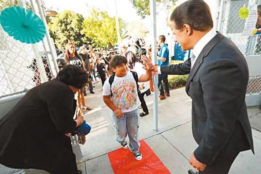 洛杉磯聯合學區教育總監卡瓦略站在小學大門向學生和家長打招呼。洛杉磯報
