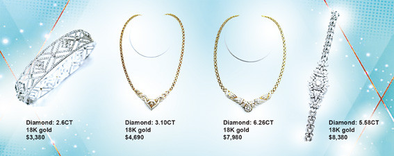 幸運珠寶所有首飾設計時尚獨特,數量有限,勿失良機。如鑽飾中以鑽石重18.57CT的18K白金鑽石頸鏈,現售$25,180,鑽石重4.44CT的18K白金鑽石手鐲,現售$5,780;鑽石重0.30CT的鑽石吊墜只售$560;鑽石重8.54CT的18K白金鑽石頸鏈只售$10,890;鑽石重2.18CT的18K白金一對鑽石耳環只售$1,968。