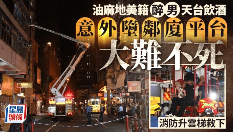 油麻地發生醉漢意外墮樓事件。昨日(30日)晚上11時許,一名滿身酒氣外籍男子出現在油麻地吳松街102號唐樓內,樣子醉醺醺,一名女住客發現後要求其離開。醉男置若罔聞,其後更走上大廈7樓天台飲酒,期間疑失足跌落鄰座的吳松街108號顯發大廈的5樓平台,所幸僅受輕傷,仍然清醒,他沿大廈外牆一條貓梯爬下,卻最終被困在3樓外牆平台。