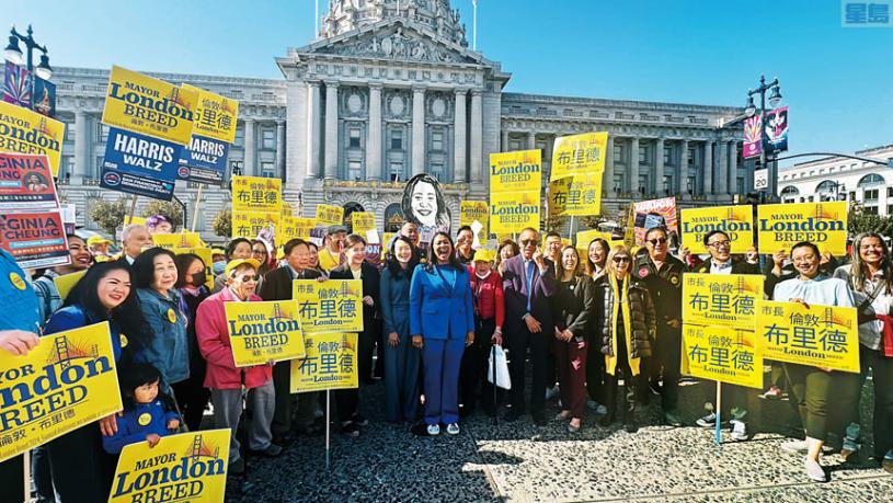 多位亞太裔社區領袖及官員昨天(1日)上午在三藩市市政廣場集會,支持市長布里德連任。現場變身一片黃色的海洋,過百支持者們高舉印有布里德的黃色廣告版,並用英文和中文高喊口號:「布里德、一定得、再四年!」
