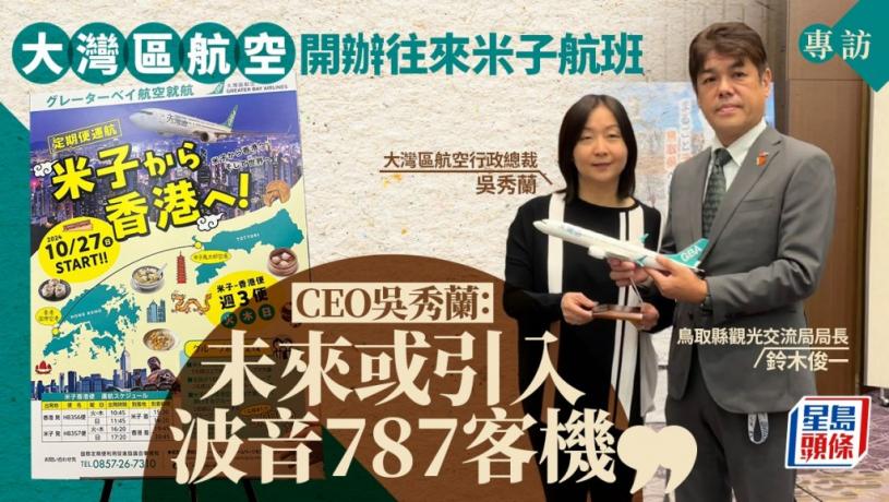 大灣區航空開辦往來香港至鳥取縣米子市的定期航班,行政總裁吳秀蘭、鳥取縣觀光交流局局長鈴木俊一在日本米子接受《星島》訪問,大談米子的風景美食和旅遊前景。吳秀蘭表示,米子有不少吃喝玩樂的地方,過去港人大多要經大阪或東京轉機,故較少機會前往,今次開辦航線冀便利兩地民眾的往來。她提及國內至今沒有航空公司提供有關航線,形容這條航線未來潛力十分高,相信可吸引本港及大灣區的市民選搭。鈴木俊一則期望未來該公司可提供每日的定期航班,以達至當地政府每年外國旅客40萬人次的目標。