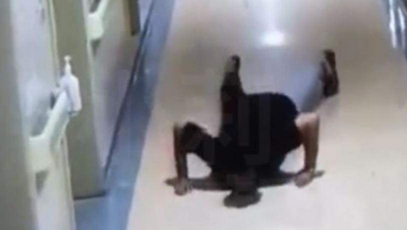 骨折夢遊男在醫院走廊做掌上壓。影片截圖