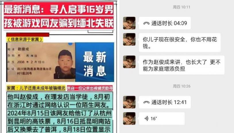 在四川宜賓筠連縣,16歲少年趙俊成今年8月疑被騙往緬北。其父稱,他在網上認識一個網友,對方讓他去「背貨賺錢」,還說背一趟能掙10萬元至15萬元(人民幣,下同)……警方調查發現,趙俊成從浙江出發直接到昆明,再到普洱、思茅,然後偷渡緬甸。目前四川、浙江兩地警方已展開相關工作。