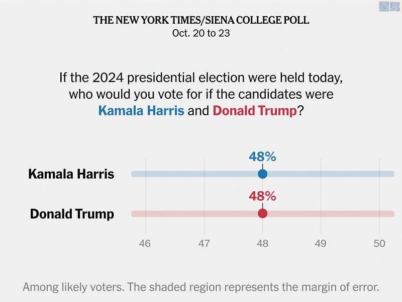 值得注意的是,特朗普在重中之重的賓州似乎民望上升,他在《紐約時報》上次調查中還落後4個百分點,但現在已經追成平手,由此反映這個州份的選情變得白熱化,19張選舉人票未知花落誰家。