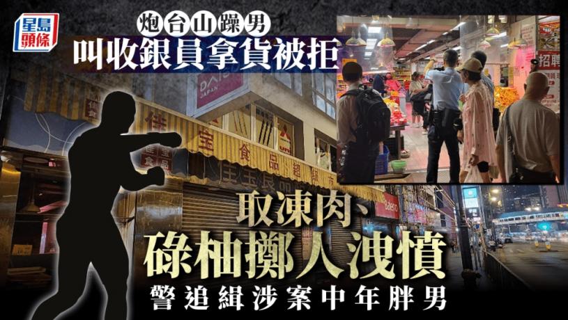 今日(11月7日)下午5時許,炮台山英皇道135至145號民眾大廈地下一間佳寶超市。據悉一對男女準備買4排凍肉,付款期間要求收銀員協助拿其他貨物。收銀員拒絕後,當中40多歲男子失控,將凍肉和收銀台旁碌柚扔向收銀員,其後揚長而去。