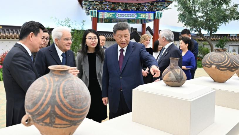 習近平夫婦同意大利總統馬塔雷拉共同賞鑒境外返還文物。 新華社