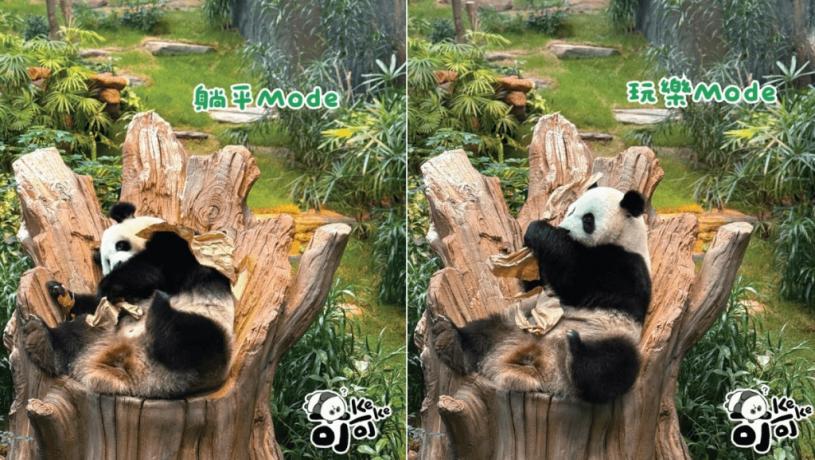 園方上載的3張照片中,可可都處於園方為牠特製的木頭「寶座」上,與樹皮作伴,可可先是任由樹皮置於身上,「躺平mode」發呆,然後突然把樹皮放到嘴裏撕咬,瞬間換成「為食mode」,最後再把樹皮拎起,「玩樂mode」情況下作勢丟掉。一張樹皮都能玩出花樣,難怪網民紛紛被可可「俘虜」。