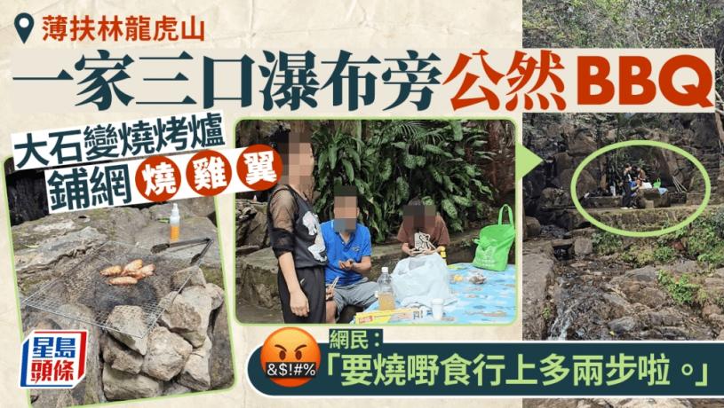 燒雞翼,我鍾意食!市民在郊外非指定地點燒烤,不僅會觸犯法例,甚至隨時招惹「祝融」焚毀美景山林。以「都市綠洲」著稱的港島薄扶林龍虎山瀑布,今(10日)午3時許,一個疑似三人家庭,在石枱旁擅自用石塊搭建燒烤爐,即場燒雞翼大快朵頤,引起途人不滿:「見到有人居然系(喺)度燒烤,激死」。