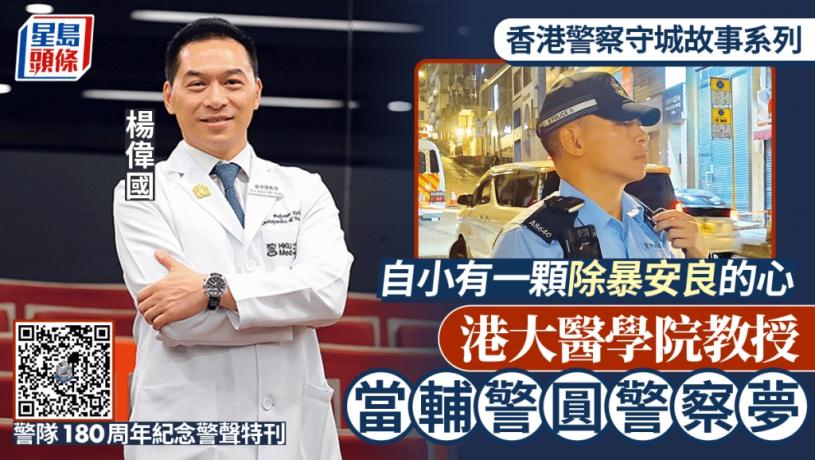 為慶祝香港警隊成立180周年,警方上月推出警聲特刊《香港警察守城故事》,刊載了多位警務人員的警隊故事,當中於醫學研究擁有一定成就的醫學教授楊偉國不忘兒時的警察夢,早前毅然投考輔警警員,希望守護市民健康的同時,亦以輔警身份維持香港治安:「成為一名警察,我感到自豪!」