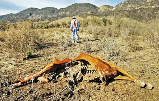 聖保拉的一位牧場主從2014年極端乾旱下死亡的一隻牲畜屍體旁走開。洛杉磯時報