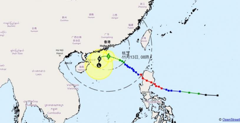 【天文台/桃芝颱風/秋颱/打風/八號風球/三號風球】熱帶風暴桃芝正接近香港,天文台今日(11月13日)下午2時40分改發三號強風信號。天文台高級科學主任李淑明今早在電台節目表示,桃芝今早朝採取較為偏北路徑,但同時已減弱,於清晨兩、三時左右減弱成為熱帶風暴,其移動路徑預計會向西北偏西移動橫過南海北部,其外圍雨帶開始影響廣東沿岸。