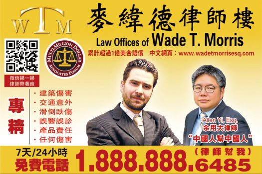 歡迎來電預約免費諮詢:1(888)888-6485律師幫我,麥緯德律師律師團隊通曉國語、粵語、福州、台山話等,如果你有意外傷害,別慌張,速與麥緯德律師樓(Law Offices of Wade T. Morris)聯繫,尋求幫助:1(888)888-6485。