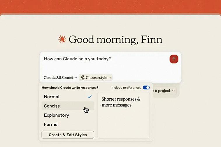 Anthropic提供三個預設選項,包括用於「清晰和優美」文本的「正式」(Formal)、用於更短直接回覆的「簡潔」(Concise)和用於包含額外細節的教育式回覆的「解釋」(Explanatory)。如果這些選項不適合用戶的需求,Claude還可以生成自定義風格,透過訓練可以模仿用戶的寫作習慣。Anthropic表示,用戶需要上傳內容樣本,然後教導機器人如何匹配。