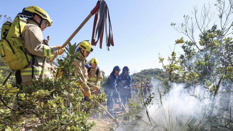 消防處今天(29日)聯同警方、飛行服務隊、漁護署、醫療輔助隊、民安隊、民政事務總署、社署及醫管局於城門水塘麥理浩徑進行代號「城門」跨部門山火及攀山拯救行動演習。