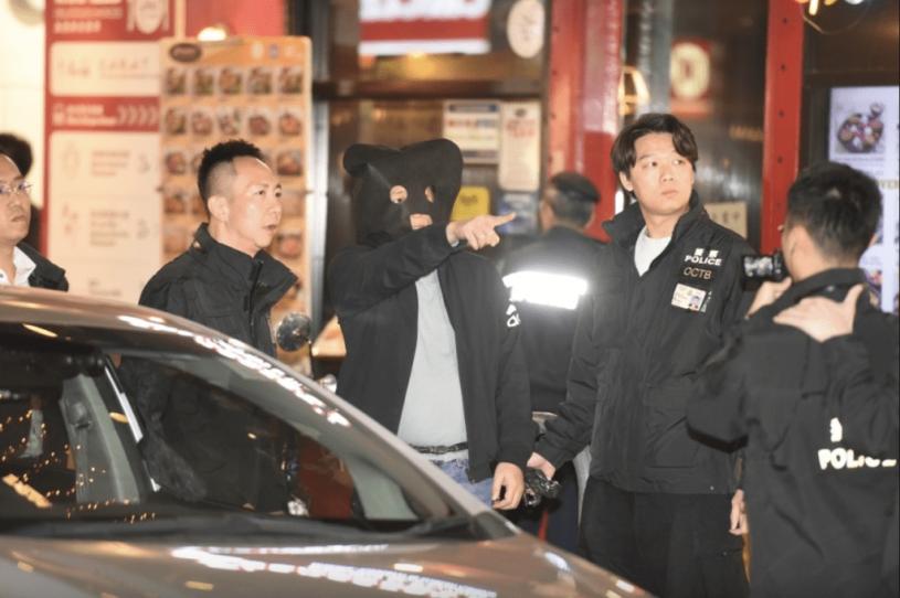 疑犯戴上頭套、雙手鎖上手銬、腰纏鐵鏈。徐裕民攝