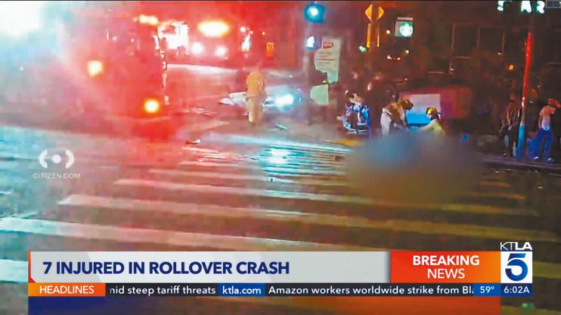 洛杉磯市中心發生一宗涉及兩車的嚴重車禍,初步消息指有七人受傷,其中一名18歲男子隨後死亡。肇事司機事後不知所蹤,警方正在尋找嫌犯。