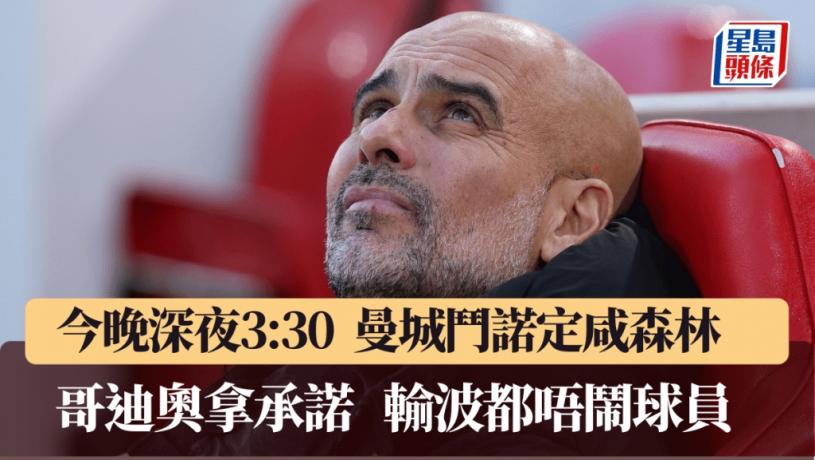 曼城和領隊哥迪奧拿正面對合作9年來最大危機,球隊在過去7場各賽事只得1和6負,英超就連輸4場,今晚英超快車對黑馬諾定咸森林,隨時再次失分。然而哥迪奧拿周一出席今場的賽前發布會時承諾,無論今仗或未來一個月的賽果如何,他都不會批評球員:「我不會在這一個、半個月內批評曼城球員,我知道現在就是這樣,反而我必須推動他們,我想推動他們,我想我比以往任何時候都更親近他們。他們所做的是獨一無二,我知道我們可以再做一次,我知道。」