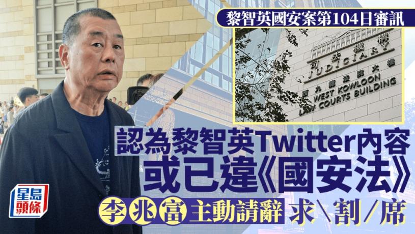 壹傳媒創辦人黎智英與《蘋果日報》三間相關公司涉串謀勾結外國勢力案今踏入第104日審訊。黎智英第12日出庭自辯,提到當《香港國安法》生效後,他已知道勾結外國勢力為刑事罪行,他再沒有請求外國制裁中國及香港,又形容如在《香港國安法》生效後仍請求外國制裁中國及香港形同自殺。而協助管理黎智英Twitter帳戶的「徒弟」李兆富,在《香港國安法》生效後表明黎智英的Twitter交由其他人管理會更好,黎指他明白為他管理Twitter一事十分危險,他便批准李兆富暫停管理其Twitter帳戶,改為要求陳沛敏為他每日提供資料在Twitter發帖。