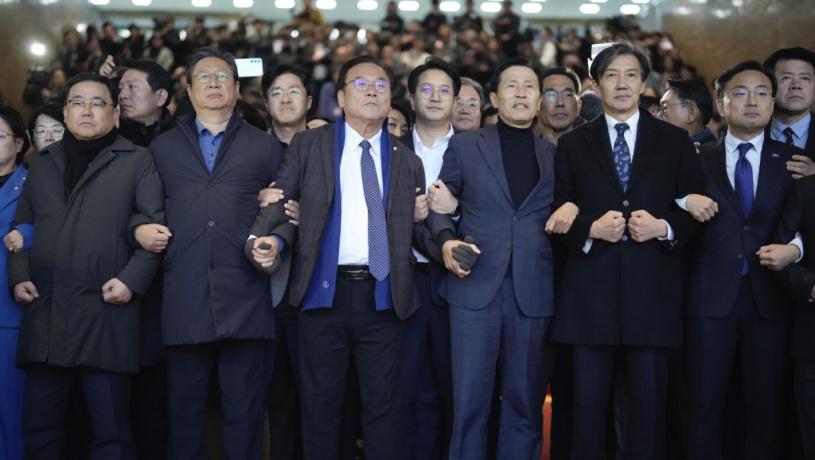 在野黨國會議員得知消息後,緊急在國會議事堂築起人牆,準備阻擋尹錫悅進入。共同民主黨對此也表示:「現階段不該讓總統進入國會。」
