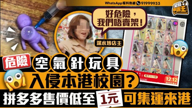 近日網上流傳一款有潛在危險的減壓玩具流入本港校園,玩法是用針筒將空氣注射入軟膠公仔,令其身體鼓脹,帖文更指深水埗有售,售價只需5元,由於針頭極尖極幼,有家長擔心小朋友誤將空針注入人體,可能會造成致命危險。《星島申訴王》派記者到深水埗福榮街尋找,多間玩具店店主都表示沒有售賣相關玩具;海關也指在多區的玩具零售店展開巡查暫未有發現,呼籲商戶如有出售應立即下架,家長亦應立即停止讓兒童把玩該款不安全的玩具。