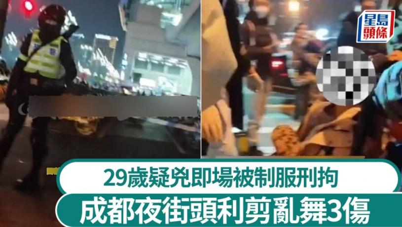 四川成都昨( 10日)晚有人持利剪在大街亂揮亂刺,導致3人受輕傷。疑兇即場為警方拘捕,正被刑事拘留調查。