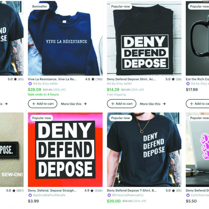 聯合健康保險行政總裁湯普森(Brian Thompson)的命案發生後,多個電商平台出現大批與案有關的商品,包括衣服、啤酒杯、聖誕掛飾甚至假子彈,不少商品還印上「拒絕、辯護、作證」(Deny, Defend, Depose)字句,藉此暗批醫療保險公司罔顧投保民眾福祉。