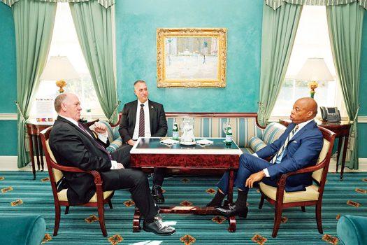 亞當斯與霍曼(左)進行會談期間,ICE紐約地區辦事處主任傑納洛(中)也在場。 市長辦公室圖片