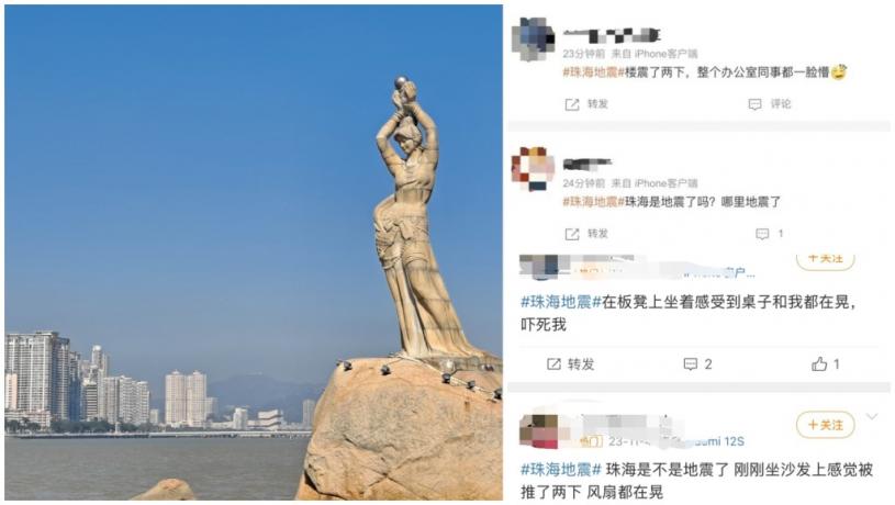 今天中午13時許,多名珠海網友發文稱感受到震感,詞條「珠海地震」一度衝上熱搜。