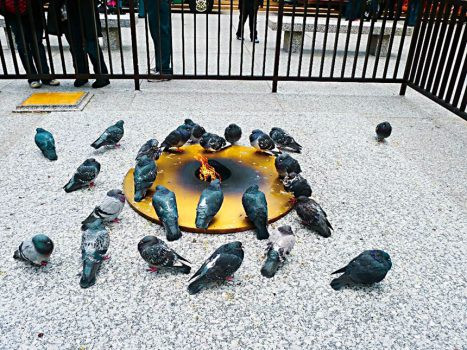戴利廣場的長明燈前,聰明的鴿子也懂得去取暖。 梁敏育攝