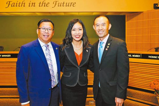 蒙特利公園市議員宣誓就職,左起:羅霈霆(Henry Lo)、楊安立(Elizabeth Yang)、吳紹榮(Vinh Ngo)。受訪者提供