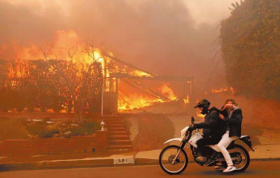 週二,兩人騎車經過太平洋帕利塞德市馬爾克斯諾爾斯社區魔法路旁一棟正在燃燒的房屋。 圖來自洛杉磯時報
