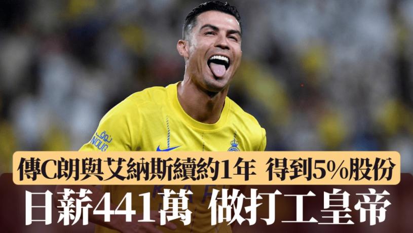 C朗拿度今夏與艾納斯約滿,據報雙方已就續約達成共識。消息指這支沙特阿拉伯豪門向C朗提出一份無與論比的合約,每月薪金達到1,525萬歐羅,每周380萬歐羅,日薪55萬歐羅,折合港幣每日有441萬港元,日日買樓投資都沒有問題。同時球會亦向他送贈5%球會股份,做球員又做老闆。