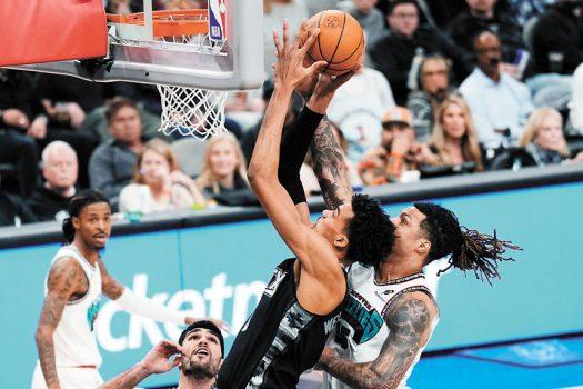 馬刺對陣灰熊的比賽中,文班亞馬(右二)在籃下爭搶。路透社