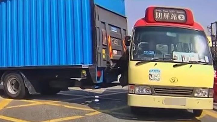 元朗發生涉及小巴的車禍。今日(16日)近中午12時,一輛紅頂公共小巴在公庵路與一輛重型貨車相撞,右邊車身被劏開,車窗玻璃應聲粉碎。網上流出事發的車Cam影片,顯示當時貨車左轉入公庵路一個路口,其間一度倒車,惟此時一輛車頭掛牌開往朗屏站的紅Van從貨車車尾駛過,貨車收制不及,右邊車尾攔腰猛撼紅Van的右邊車身,登時將紅Van車身劏開。拍下車Cam片的司機目睹如此驚險,也不禁「哇」一聲大叫,並將車輛駛後保持距離。