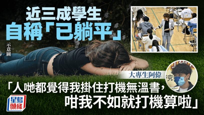 剛考完DSE的學生阿偉,正在專上學院就讀社會服務課程,他將自己定義為「無望型」,因備考DSE時感受到努力無結果所以選擇「躺平」,稱「溫同唔溫都差唔多,不如唔好俾自己壓力」;同時家長、老師亦沒有看到他的努力,他指「人哋都覺得我掛住打機、無溫書,咁我不如就打機算啦。」談及未來打算,他希望從事一份輕鬆、無壓力的工作,形容「可以維持到生活就夠」。當然,他亦不排除未來可能找到有興趣的工作而改變「躺平」想法。