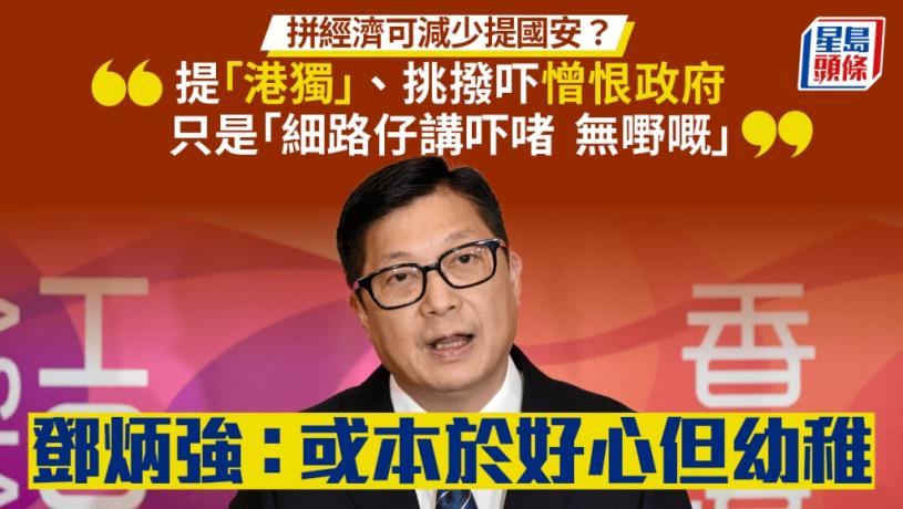 鄧炳強形容「安全」和「發展」是鳥之兩翼、車之兩輪,舉例指在2019年有人四處扔汽油彈、放火,反問無一個安全環境「又點會有經濟發展?」他認為國家安全風險不會因為「唔講、無人講」便不存在。