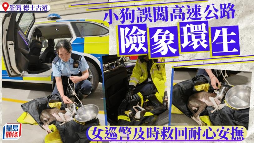 警方圖片所見,小狗獲救後由警車帶到警署照顧。由於小狗受驚,警員用反光外套裹住小狗為牠保溫,遞上食水之餘,又不斷撫摸試圖安撫其情緒。及後,愛協人員到場接手,檢查小狗傷勢並將其帶走。
