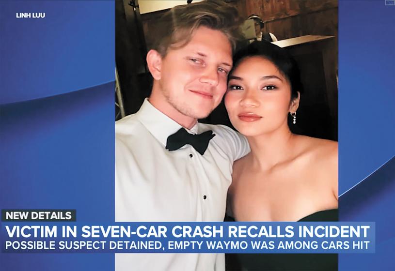 27歲越裔女傷者Linh Luu(音譯︰劉玲)坐在病床上接受ABC7新聞獨家訪問。車禍發生在19日約傍晚6時,劉玲與27歲男友羅曼年科(Misha Romanenko)和愛犬Keepers正在開車前往機場接她的外婆和阿姨,但在第6街與Harrison街路口遇上這場重大車禍。