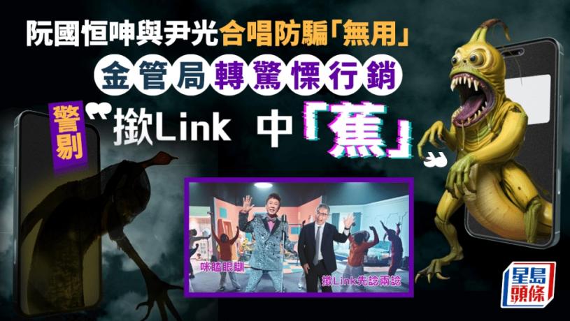 金管局去年為防詐騙,特意由副總裁阮國恒粉墨登場,與「光b」尹光合唱,教導公眾「咪亂撳Link」。不過本港詐騙個案仍有增無減,金管局預告新防騙工作會改變表達方式,宣傳口號換成「撳LINK中『蕉』」,直接警剔胡亂點擊連結的後果。連串宣傳將在農曆新年前後陸續推出。