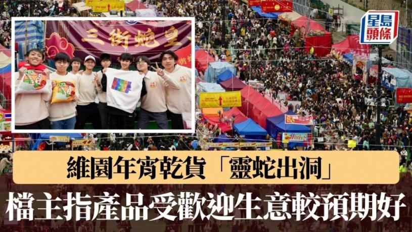 售賣蛇年揮春、利是封、遊戲套裝等的乾貨檔主鄧先生表示,今年是第一次在維園擺年宵攤位,生意和人流都比預期好,產品亦很受歡迎。他指,售賣的產品都是自家設計和印刷,其中遊戲套裝80元一盒,又希望明日會有更多人來行年宵。