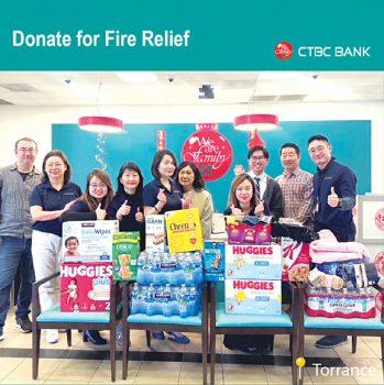 南加州大火災情發生後,美國中國信託銀行立即與當地非營利組織Shelter Partnership合作,與中國信託銀行位於南加州洛杉磯地區的14家分行人員及客戶齊心協力,收集並捐贈總價值超過$15,000美元的救援物資,贈予給需要幫助的災情受災戶。救援物資包括嬰兒尿布,濕紙巾,瓶裝水,蛋白質能量食品、保暖衣物等,整合後一併運送至洛杉磯市中心的Dream Center,以便為受災戶提供第一線及必要的資源協助。