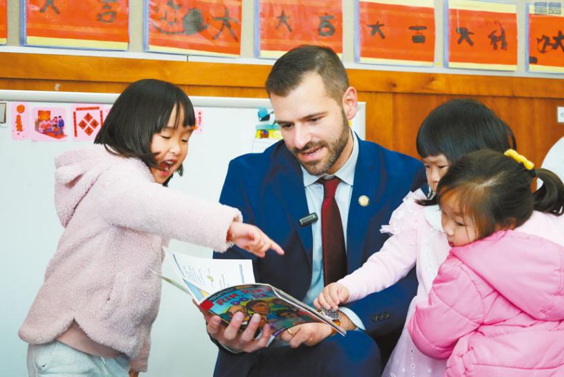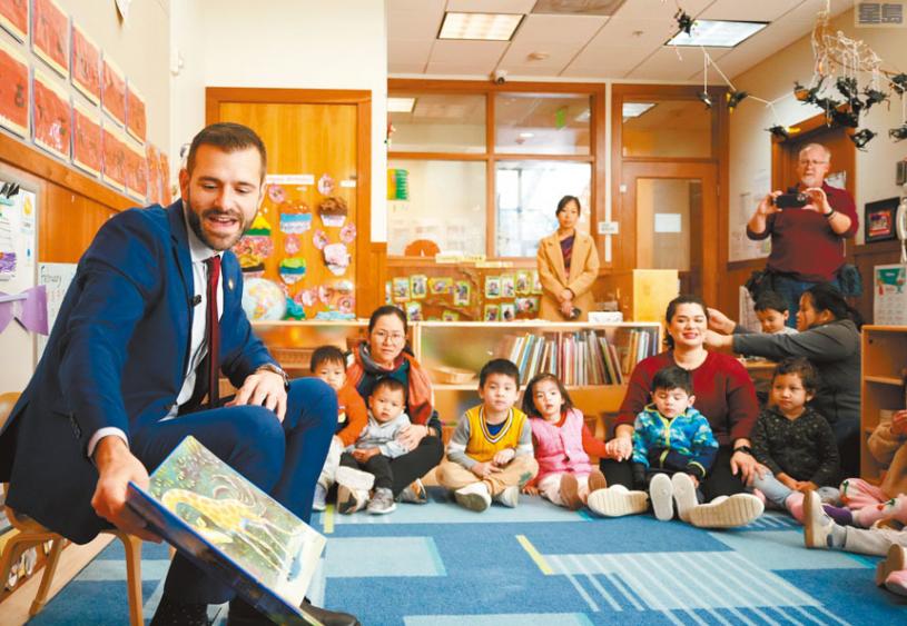 三藩市第三區市參事李爾德(Danny Sauter)5日上午來到啟明啟蒙學校百老匯分校,給孩子們講故事,與師生一起參加全美讀書日活動。