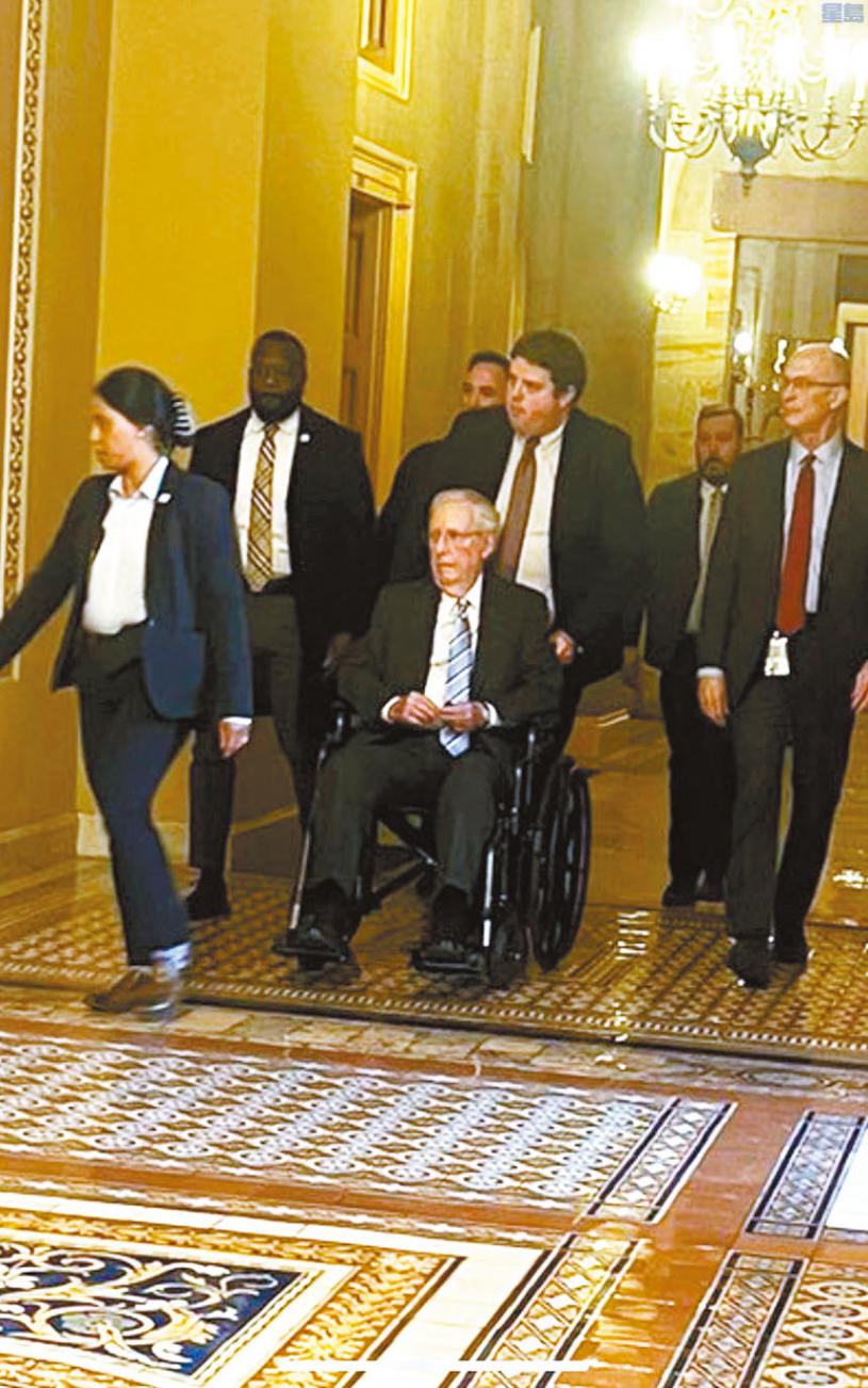 82歲的共和黨參議員麥康諾(Mitch McConnell)的健康續受關注,他5日在國會大樓兩度跌倒,需要以輪椅護送離開。其辦公室表示,麥康諾情況良好,使用輪椅純粹以防萬一,又指其左腿因幼時罹患小兒麻痺出現後遺症,但是不會影響正常工作。不過,辦公室未透露麥康諾有否因跌倒受傷。
