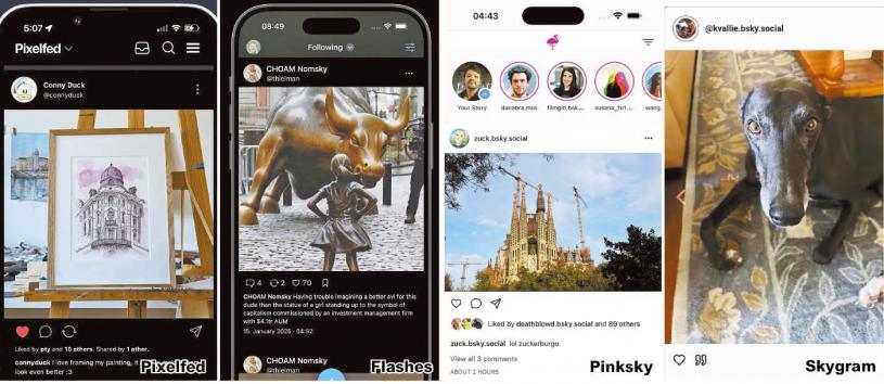 Pinksky:Bluesky的另一款用戶端Pinksky,嘗試提供以照片為主的社交體驗,旨在吸引那些希望透過照片、而非爆紅內容或短片Reels來交流的Instagram舊愛。Pinksky採用熟悉的介面設計,包括頁面頂部的可點擊「限時動態」區域(Stories)。但不同於與從零開始建立的新程式,Pinksky允許用戶直接連結Bluesky上既有的好友與關注者,即使這些人尚未加入Pinksky,也可與其互動。