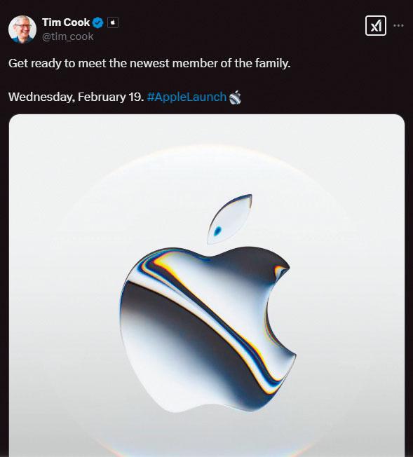 蘋果將於本月19日一場活動展示最新產品。執行長庫克(Tim Cook)在社交媒體X發文稱「請準備好與本公司產品系列的新成員見面」,還配上一個展示蘋果商標的動態圖,外界預期會是很久沒有大升級的iPhone SE。